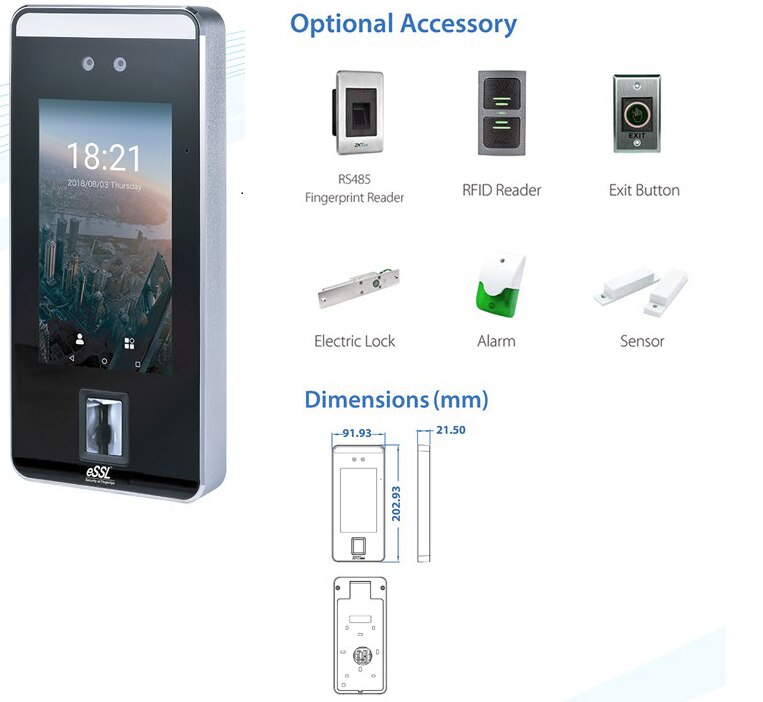 ESSL SPEED FACE ATTENDANCE MACHINE IS THE LATEST MACHINE WHICH IS BASED ON VISIBLE LIGHT DETECTION ARTIFICIAL INTELLIGENCE TECHNOLOGY. ESSL SPEEDFACEV5 BIOMETRIC ATTENDANCE MACHINE DETECTS FACES FROM A DISTANCE AUTOMATICALLY FOR KEEPING ENTRY AND EXIT RECORDED IN ALMOST NO TIME AND SMOOTHLY. ESSL SPEED FACE MACHINE HAS 5 INCHES HD DISPLAY QUAD CORE HIGH PROCESSING SPEED 2GB OF INBUILT RAM MEMORY DUAL LENS HD CAMERA, 6000 FACES CAPACITY, ID CARD RFID PROXIMITY EM AND MIFARE ANY OF THE CARD TECHNOLOGY CAN BE USED, TOUCH SCREEN FOR EASY OPERATION, COMPATIBLE WITH EXTERNAL WEIGAND EXIT READER, TCPIP LAN PORT AND WIFI FEATURE FOR COMMUNICATION, ACCURATE AND FAST FACE RECOGNITION, LIVE FACE DETECTION TECHNOLOGY AND AND UP TO 1 METER FACE RECOGNITION DISTANCE.