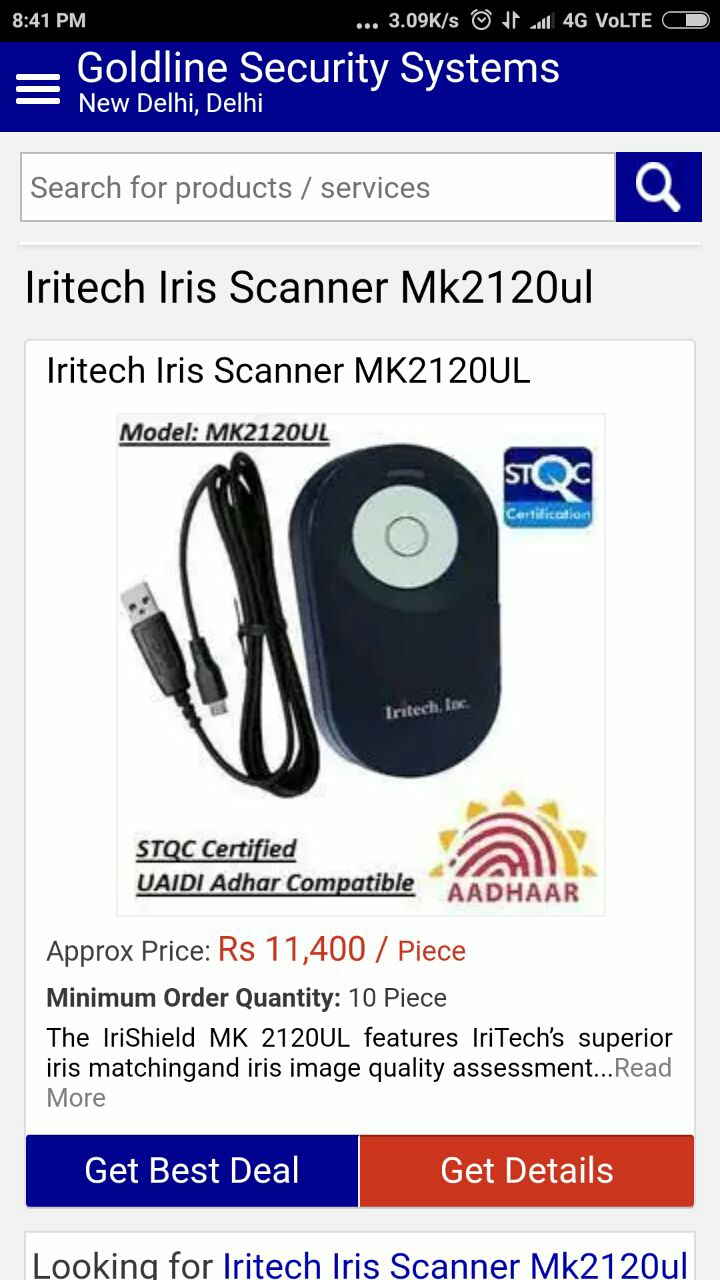 Aadhaar Enrolment and Aadhaar Update up can also be done with single iris and single Fingerpeint scanner. The devices from Iritech Iris Scanner and Mantra Fingerprint Scanner can be used with UCL application for authentication of people through retinnal scanning. UIDAI approved and STQC 15cm Iris Scanner of Iritech Inc Model MK2120U is the latest device which is compatible with UCL applications. 5cm Iris scanner model MK2120U will not be allowed to link with UCL now onwards as directed by UIDAI and confirmed by the manufacturer Iritech Irishield Inc.