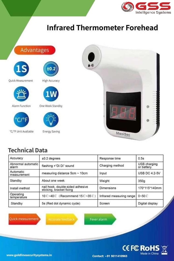 TEMPERATURE CHECKING MACHINE FOR DETECTION AND DISPLAY OF BODY TEMPERATURE WITH ALARM. WE SUPPLY COMPETE SYSTEM FOR ALL TYPES OF TEMPERATURE CHECKING DISPLAY ALARM MACHINES FOR CHECKING AND NOTIFYING THE HIGH BODY TEMPERATURE OF THE INCOMING EMPLOYEE STAFF AND WORKERS. THIS TEMPERATURE CHECKING SYSTEM HAS FASTER MEASUREMENT FUNCTUIN WITH HIGHEST ACCURACY IN SCANNING HUMAN BODY TEMPERATURE. THIS DIGITAL TEMPERATURE MACHINE HAS AUTOMATIC ABNORMAL TEMPERATURE CHECKING ALARM WHICH INFORMS ABOUT THE HIGH BODY TEMPERATURE PERSON IMMEDIATELY. THIS IS TOUCH LESS NO TOUCH TEMPERATURE CHECKING SYSTEM WITH A READ RANGE OF 5-10 CM WHICH CAN BE MOUNTED ON WALL AT CORRECT HEIGHT WITH THE WALL FIXING BRACKET. THIS TEMPERATURE MACHINE PERFORM AT HIGHER SPEED WITH A RESPONSE TIME UP TO HALF SECOND SUITABLE TO DETECT BIGGER STAFF OR EMPLOYEE STRENGTH AS PER THE REQUIREMENT OF AN OFFICE, FACTORY, HOSPITAL, WAREHOUSE OR HOTEL ETC.DISPLAY AVAILABLE ON THE FRONT FACE OF MACHINE SHOWS TEMPERATURE READING BY MEASURING WITH INFRARED WITH TEMPERATURE RANGE OF 0 TO 50 DEGREE. CONTACT OUR TECHNICAL TEAM FOR BEST PRICE AND CURRENT REQUIREMENTS.