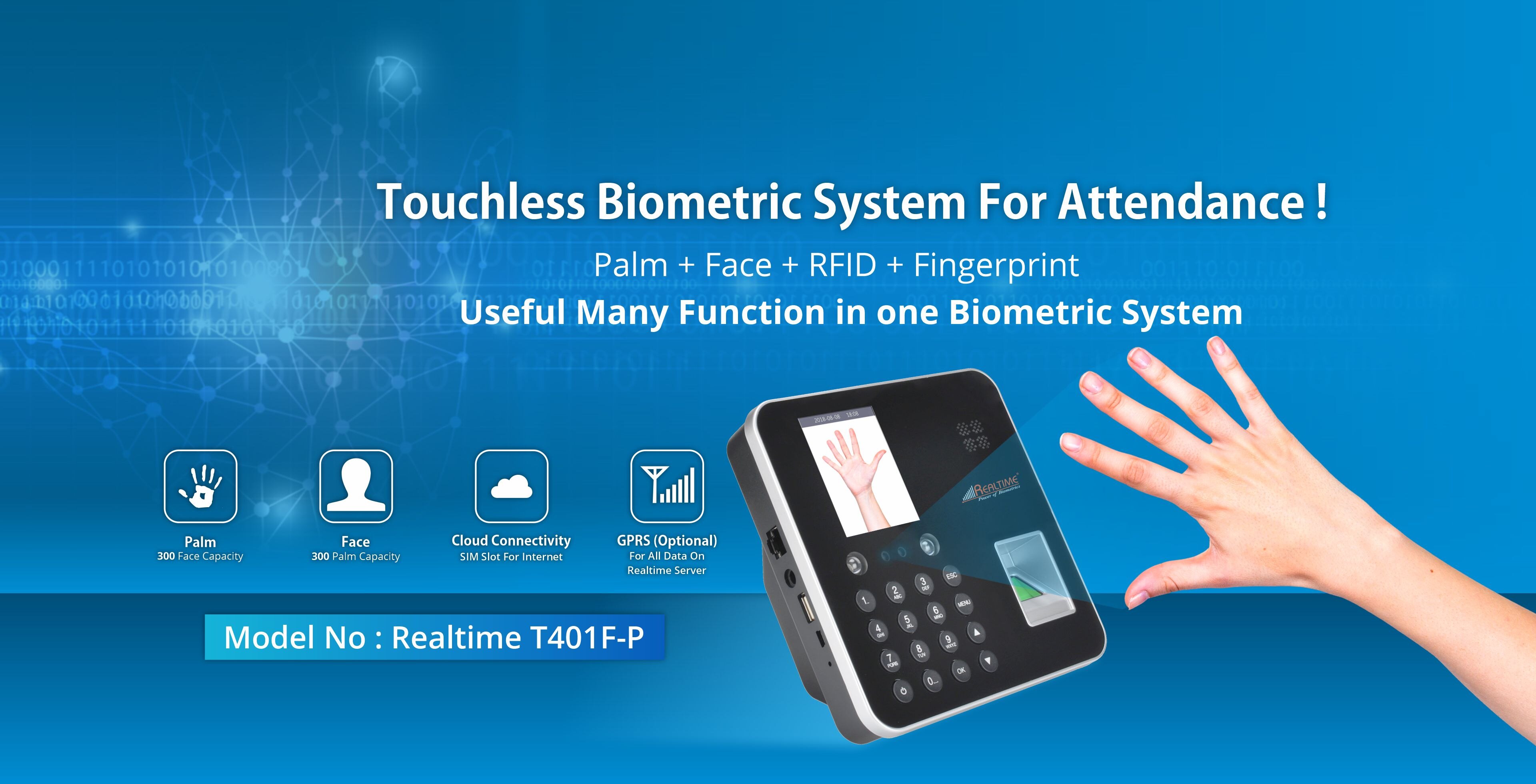 REALTIME T401F IS ADVANCE PRODUCT WITH DUAL READER FOR PALM AND FACE SCANNING TO MARK ATTENDANCE FROM A DISTANCE SUPPORTING HYGIENIC ENVIRONMENTS THROUGH NO TOUCH SOCIAL DISTANCING ENVIRONMENT TO AVOID TOUCH GENERATED INFECTIONS AND VIRUSES. THIS IS THE BEST MODELS FOR TIME ATTENDANCE MARKING FROM A DISTANCE TOI SUIT SMALL AND MEDIUM OFFICE REQUIREMENTS. REALTIME T 40F HAS INBUILT ACCESS CARD READER AS AN ADDED FEATURE WITH 1000 CARDS CAPACITY FOR CARD BASED ATTENDANCE SYSTEM. REALTIME T-401F FACE AND PALM BIOMETRIC MACHINE TCP IP AND USB DATA TRANSFER COMMUNICATIONS TYPES TO PROVIDE DATA IN COMPUTER SOFTWARE OR CLOUD SERVER WITH MOBILE APPLICATION AS PER THE REQUIREMENTS. REALTIME T401 SUPPORTS MULTI OFFICES, MULTI LOCATION SETUP TO MARK AND COLLECT ATTENDANCE DATA CENTRALLY THROUGH CLOUD SERVER DATA ACCESS OR WE BASED TIME ATTENDANCE SYSTEM.